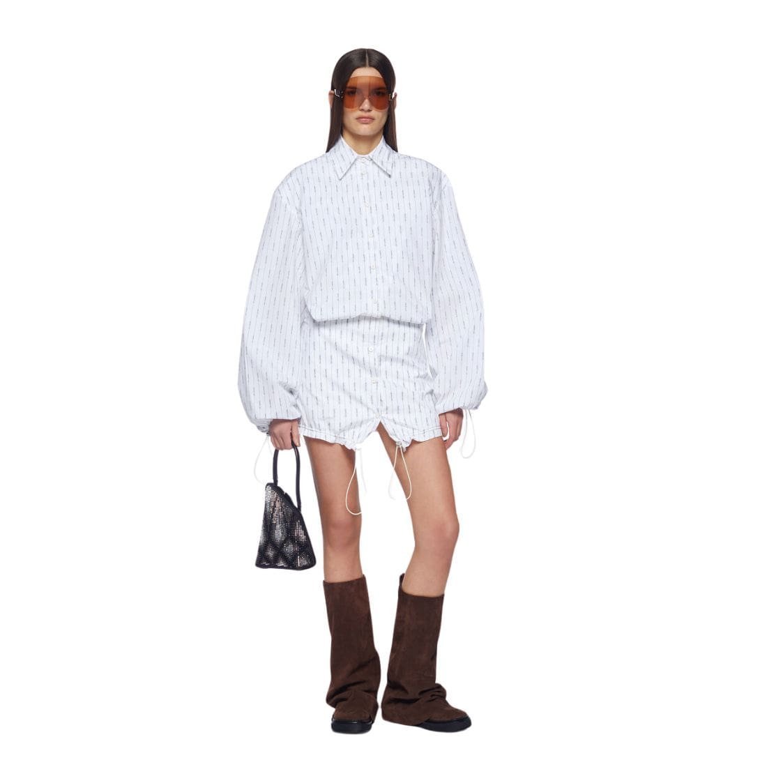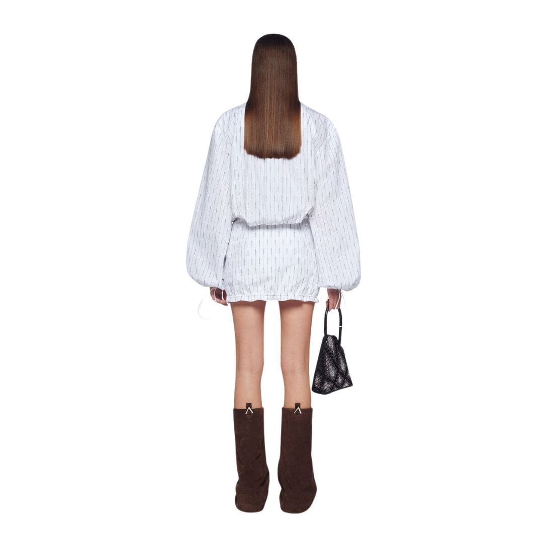 The Attico White and Black Mini Dress in white and black striped logo cotton jacquard with a fitted basque, drawstring detail, and logo metal stops. Made in Italy.