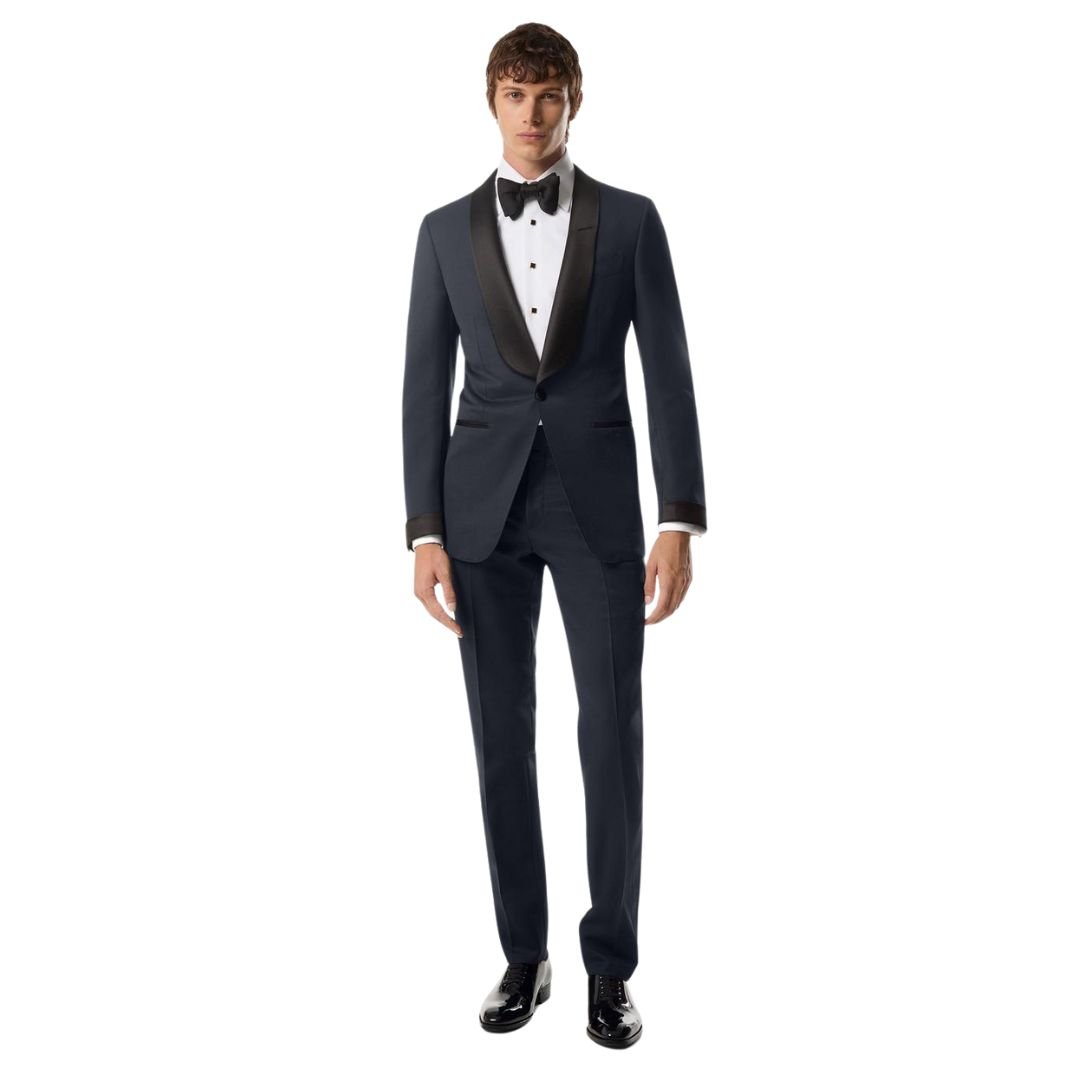 This tuxedo features a sophisticated shawl collar, offering a smooth, uninterrupted lapel line for a contemporary yet timeless look. The satin lapel and side stripe provide a refined contrast, enhancing its formal appeal. The double vent ensures ease of movement while maintaining a sleek and structured fit.