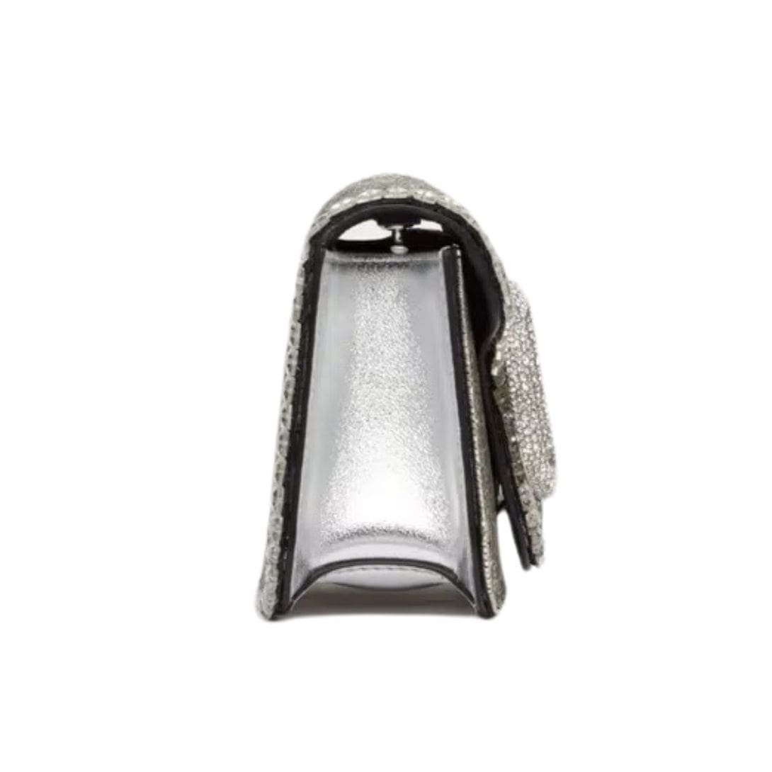 For added convenience, the bag features a detachable sliding chain strap and a removable handle, allowing it to be worn as a crossbody or shoulder bag, or carried as a handbag.