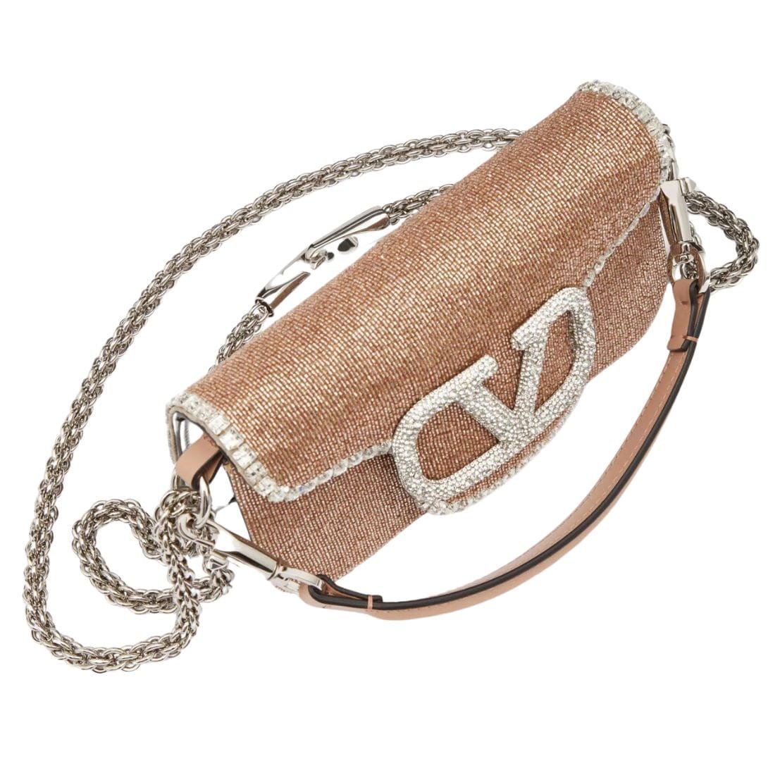 Adorned with intricate embroidery and leather trim, the Valentino Garavani Locò small shoulder bag features the iconic VLogo Signature element, embellished with Swarovski crystals, adding a touch of glamour to your ensemble.