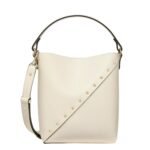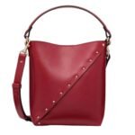 Introducing the Valentino Garavani Rockstud Wispy calfskin bucket bag, crafted from luxurious calfskin adorned with small studs set on a diagonal. This versatile bag can be worn over the shoulder/crossbody or carried by hand, thanks to the adjustable shoulder strap and leather handle.