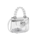 At first glance, the bag’s transparent PVC material immediately captivates the eye, offering a contemporary twist on classic design. The clear exterior provides a glimpse into the bag’s interior, adding an element of intrigue and allure. Embossed with the legendary La Medusa emblem, the bag exudes opulence and prestige, serving as a symbol of Versace’s rich heritage and unparalleled craftsmanship.