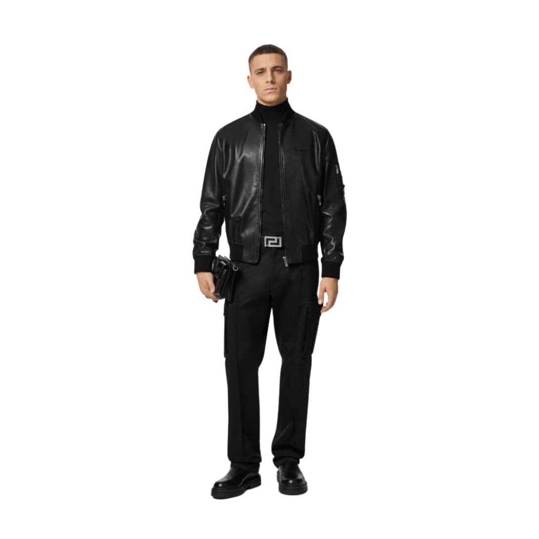 The jacket’s versatility is another hallmark of its design, effortlessly transitioning from casual daytime outings to upscale evening affairs. Pair it with distressed denim and a graphic tee for a ruggedly stylish look, or layer it over a tailored shirt and trousers for a more polished ensemble. Whether worn as a statement piece or as a subtle accent to elevate any outfit, the Versace Leather Bomber Jacket is sure to command attention and leave a lasting impression.